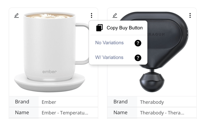 When you're ready to add the buy button to your website, you'll click the three vertical dots on the product in your My Products section, then select the buy button option you want. If you don't want to manually add products, you can use the API to do it programmatically.